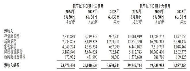 观察各业务表现,2025年第二季度,存量房业务净收入为67.19亿元,新房业务的净收入为86.19亿元,家居家装的净收入为45.65亿元,房租租赁服务的净收入为56.75亿元,新兴业务及其他的净收入为4.32亿元。
